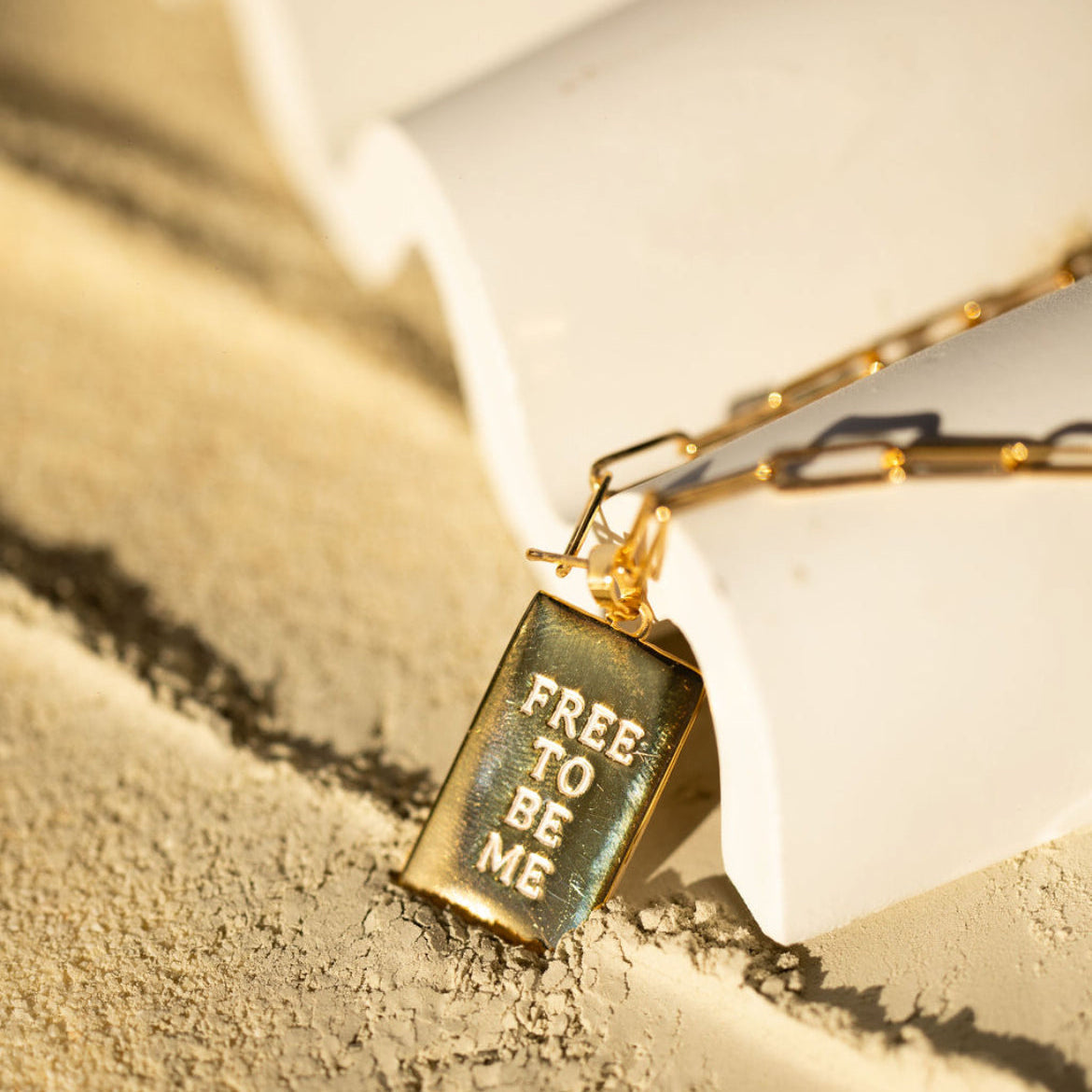 This stunning double-sided jewelry piece, is a symbol of empowerment and authenticity. On one side, it shines with elegance, while the back features the powerful words “Free to Be Me.”