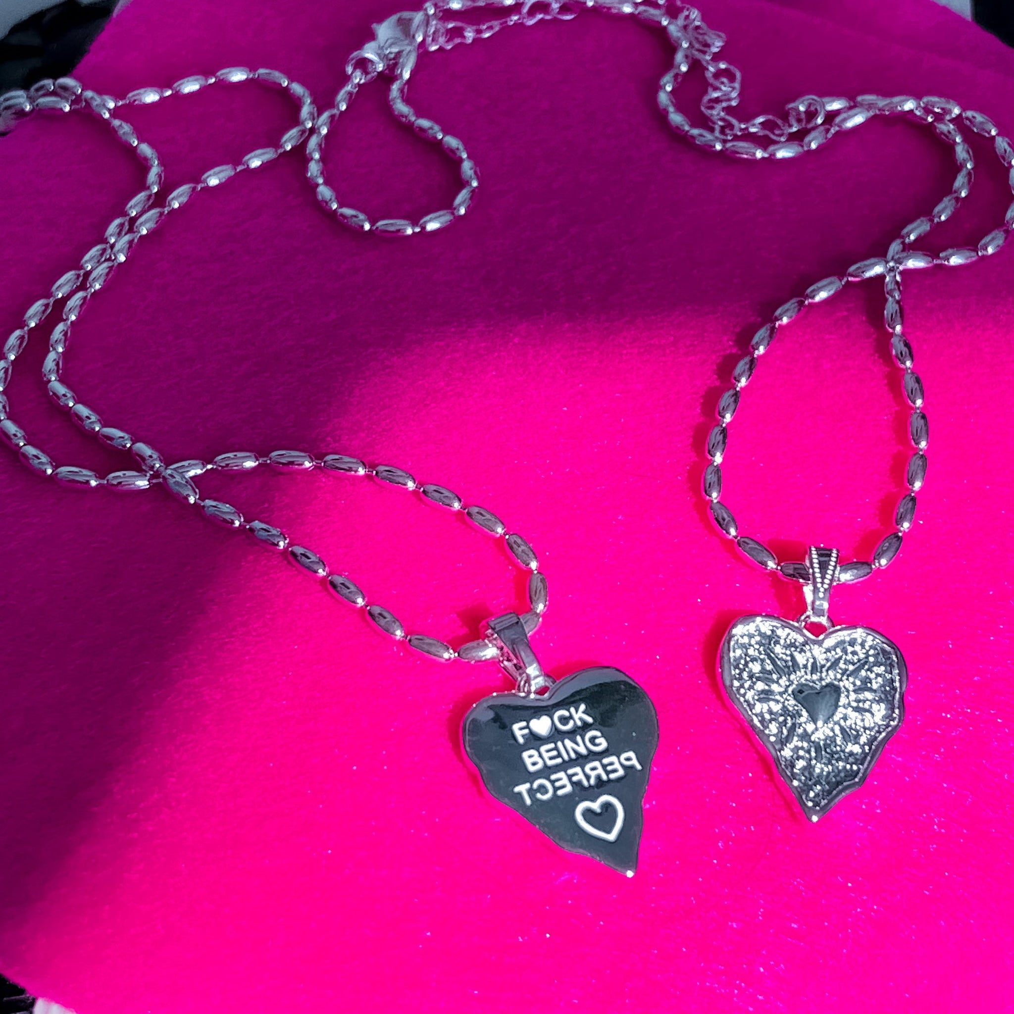 Our DBL double-sided heart necklace features an imperfect design on the front and the bold phrase “F🖤CK BEING PERFECT” on the backside, written in ITS OWN perfectly imperfect way .