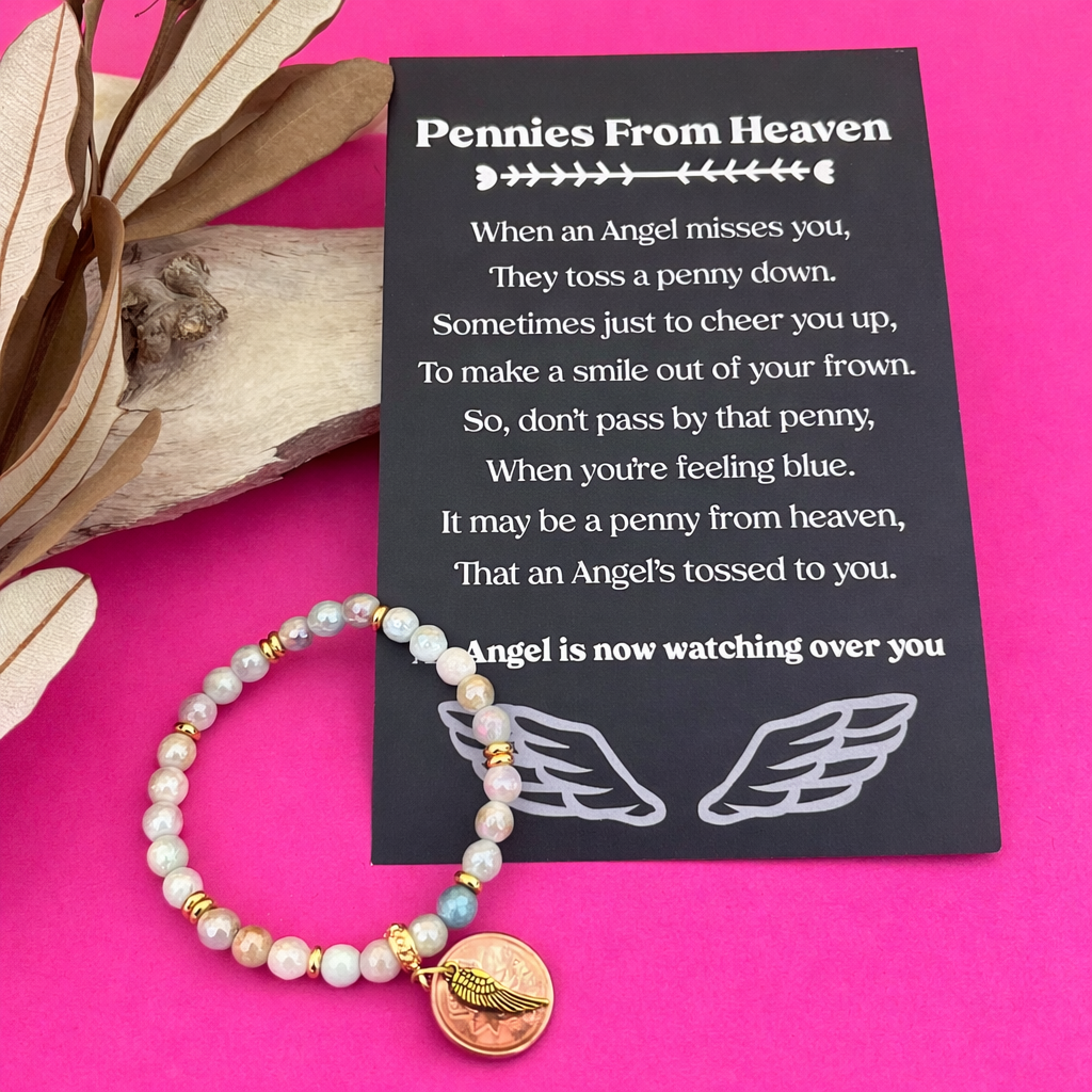 Our Pennies From Heaven Bracelet is a heartfelt piece designed to inspire joy, love, and hope. Featuring a charm that symbolizes the presence of an angel watching over you, this necklace serves as a beautiful reminder that you are never alone.